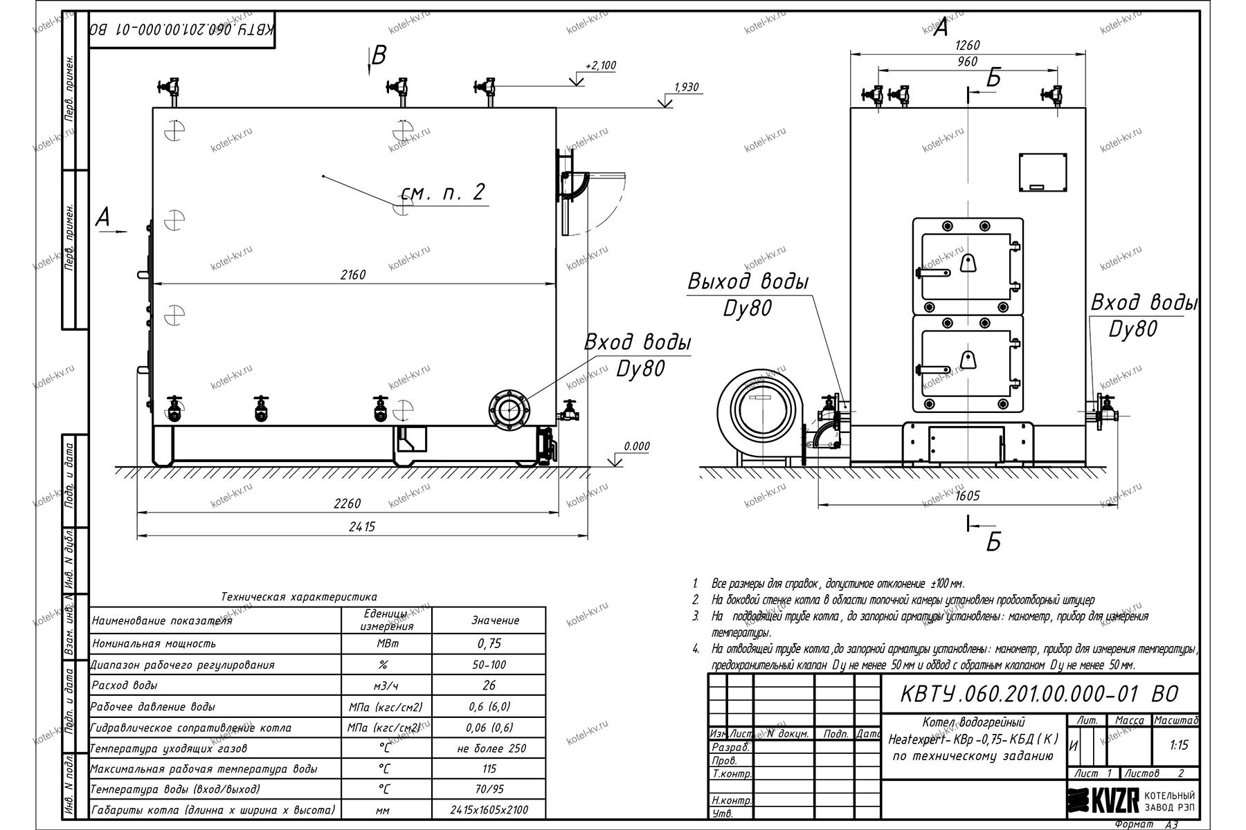 Завод производитель в г Петрозаводск в процессе производства и технического контроля подвергает промышленный КВр-0,75 К с колосниками гидравлическому испытанию давлением 0,9 МПа (9 кгс/см2).
